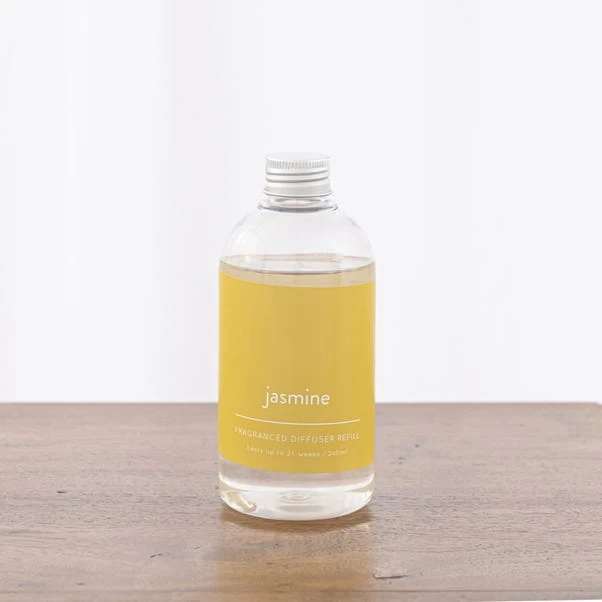 Add a delicate scent to your home with our Jasmine Diffuser Refill. A delicate jasmine scent infused with dewy green accords resting on a floral heart of sweet rose, muguet and cyclamen brushed with soft musks on the base within a 240ml bottle. Lasts up to 21 weeks, this diffuser refill is perfect for topping up glass diffuser bottles once finished.