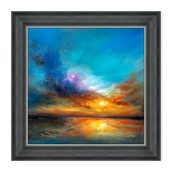 Add this compact square print to a blank space in your house for a burst of energy and colour and a contemporary edge. Featuring an abstract sunset scene full of vibrancy, this piece is bordered with a bold grey frame for a modern and stylish finish.