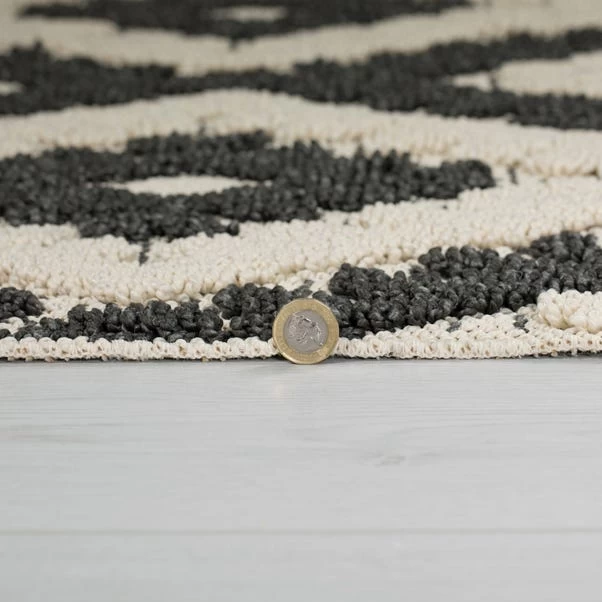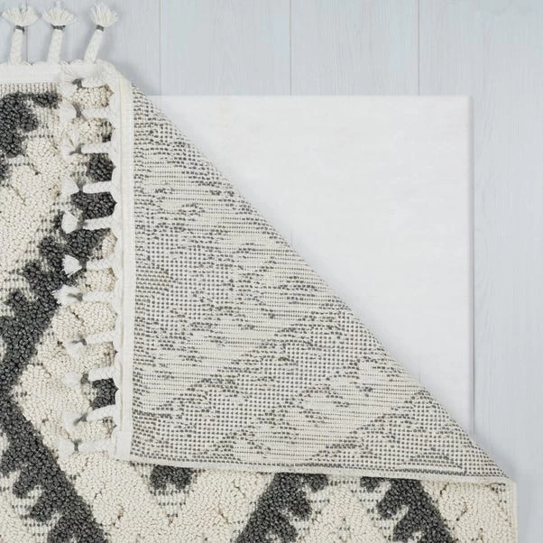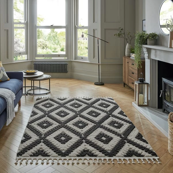 Say hello to the Amezri Rug. Pair bold monochromatic shades with artisanal style tassels and weaving to create the ideal laid-back, bohemian centre piece. The hand-tufted effect is ideal for getting some softness into your space. In 100% polypropylene pile these rugs are extra hard-wearing, ideal for busy homes. We love using the Amezri Rug to create a statement zone in living rooms and dining rooms.