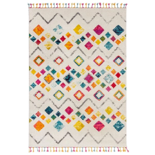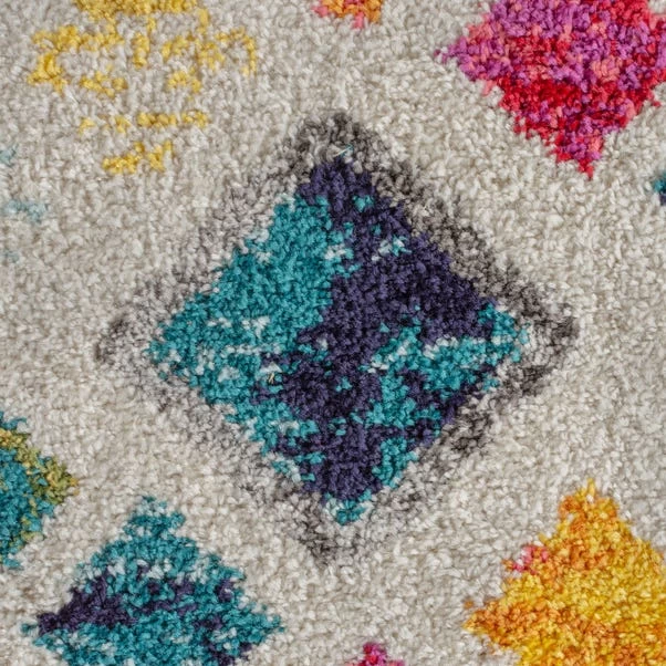The Dahra Berber rug uses a busy geometric effect with a bold multi-coloured palette for a bohemian Berber feel. In 100% polypropylene our Dahra Berber rug pairs a soft touch pile with hard-wearing qualities, perfect for high-traffic zones. We love using this classic Berber style with bright shades to add a playful statement to fun living rooms and bedrooms. The hard-wearing qualities and colourful pile make it the ideal option for busy nurseries and kids rooms too.