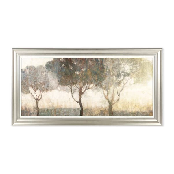 Display this textured print of trees in a misty space in your living room for a statement piece of artwork which emanates calm and stillness through soft and muted tones. Presented in a wide landscape format, this impressive piece has a glistening champagne frame to add style and charm to your home.