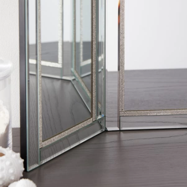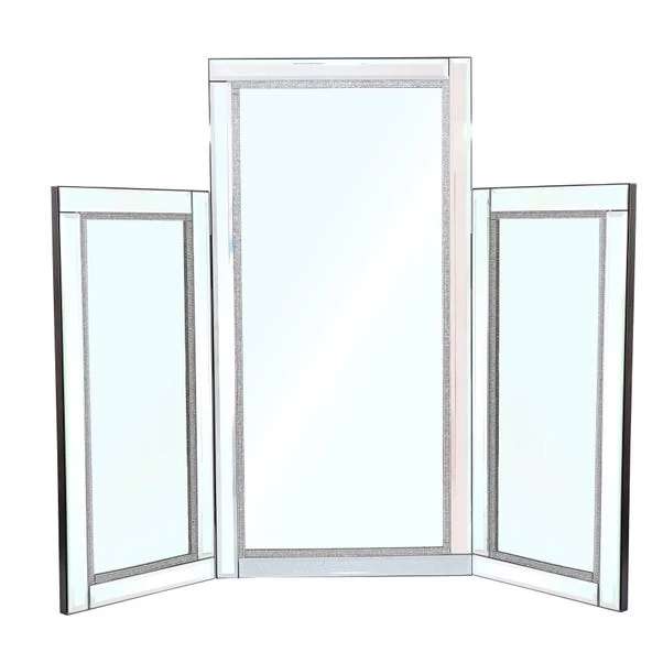 This beautiful three-folding mirror will bring a touch of elegance to any room. Its simple and modern free standing design of the Diamante Dressing Table Mirror makes it perfect for any vanity table. This mirror features a bevelled edge with stunning diamante details.