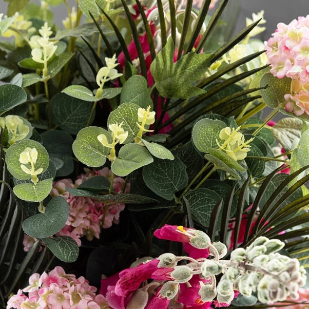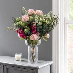 With its elegant design, this bouquet contains a stunning mix of realistic artificial flowers, including Foxgloves, Snowballs, Eucalyptus and Palm leaves. This stunning arrangement is perfect for a floral vase display to decorate your home, and would be ideal as a gift or as decoration for a special occasion