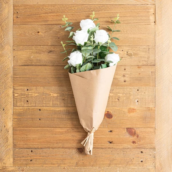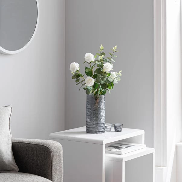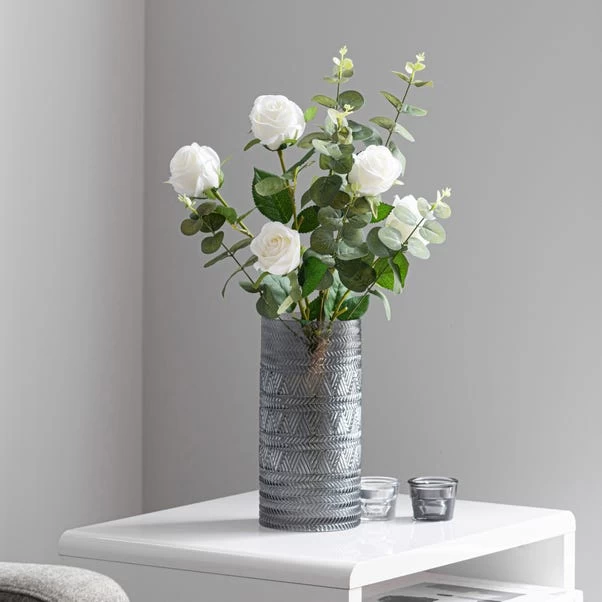 Perfect for adding an elegant touch to your home, this bouquet contains a stunning mix of realistic artificial flowers, including white Roses and Eucalyptus stems. This stunning arrangement is perfect for a floral vase display to decorate your home, and would be ideal as a gift or as decoration for a special occasion.