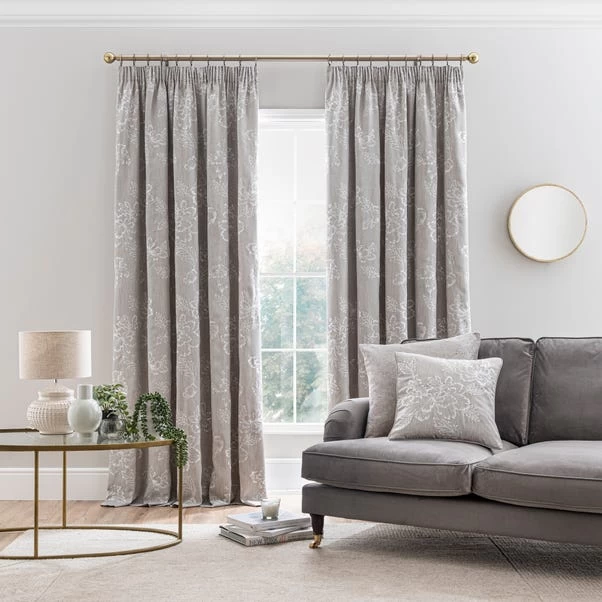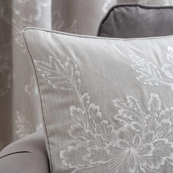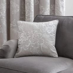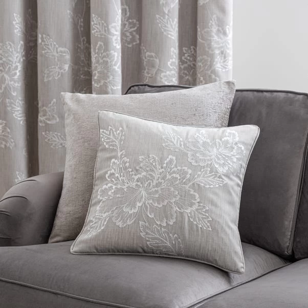 This timeless cushion boasts beautiful blossoms and leaves in off-white finely embroidered onto a grey backdrop. This cushion comes complete with an inner feather filled for your comfort. Matching curtains available in range of sizes.