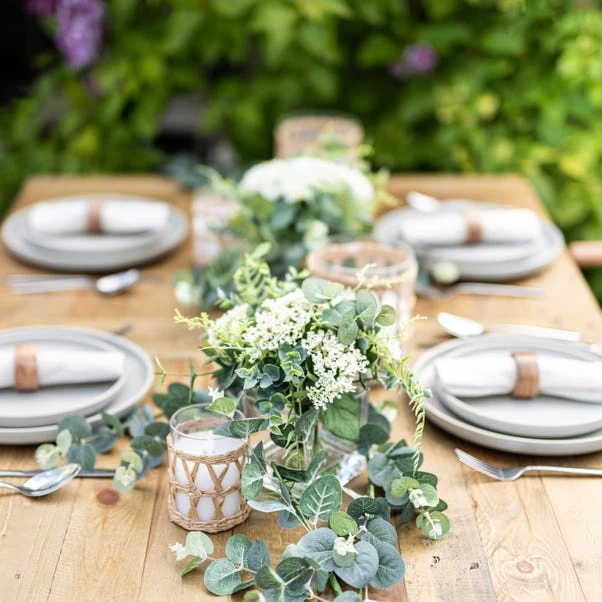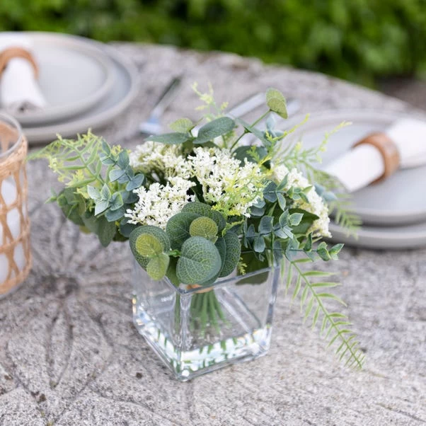 Featuring eucalyptus, fern, and Queen Anne’s lace, this foliage arrangement in glass cube vase is ideal for wedding table centrepieces or room décor. Requiring no maintenance, this piece can be reused and matched with our range of co-ordinating foliage wedding florals.