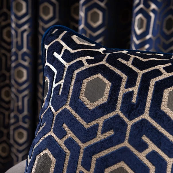 This Geo Cut velvet cushion boasts a contemporary geometric design in a luxurious navy velvet. This cushion comes complete with an inner feather filled for your comfort. Matching curtains available in range of sizes to create a coordinated look.
