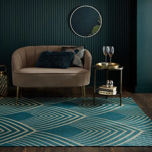 The Geo Metallic Rug pairs a peacock-inspired geometric design with a luxe palette of teal and gold, ideal for adding Art Deco-inspired style to your space. The flat blended composition makes the Geo Metallic Rug the ideal rug for high-traffic areas and sitting under furniture. We love using the Geo Metallic Rug in dining spaces to define a central socialising spot, or to add a luxurious look to your living space.