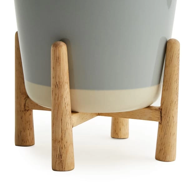 Brighten up your outdoor space with this stunning grey ceramic planter and wood Stand. Featuring a glossy glaze finish and supported by four wooden legs, a perfect way to bring warmth and greenery to your living area.