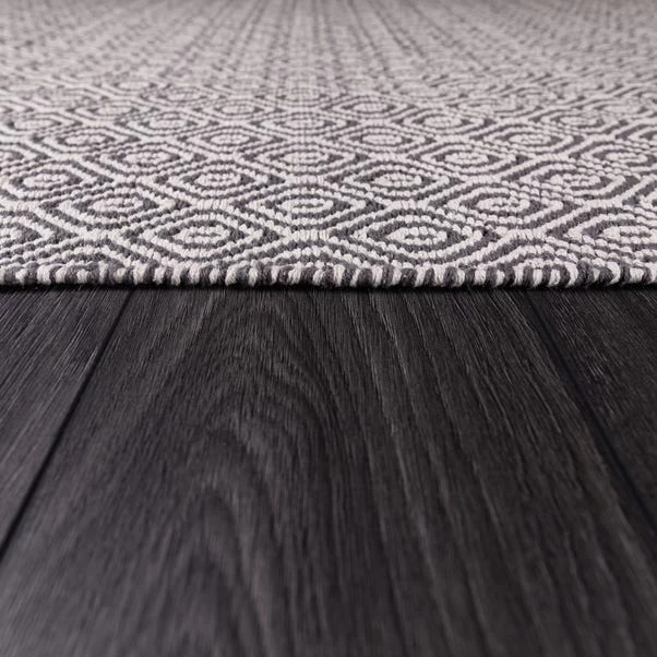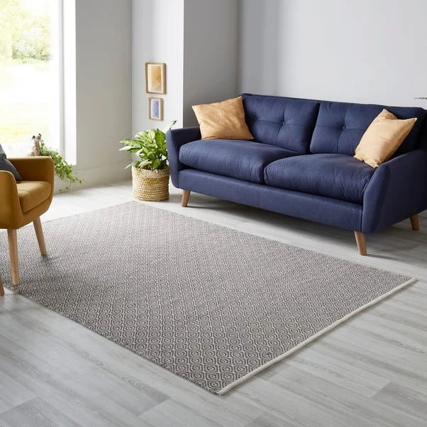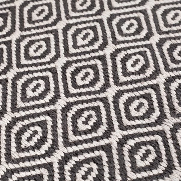 Beautifully created, this stylish rug features a diamond shaped design and is fashioned in a grey colourway. Made from a soft cotton blend, this elegant rug is crafted with a dense short pile and is machine made, boasting minimal shedding properties and providing a stain repellent quality. Available in a choice of sizes.