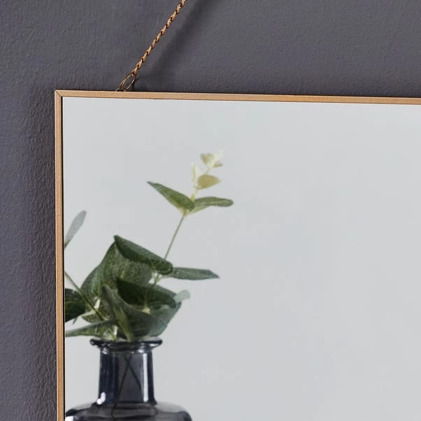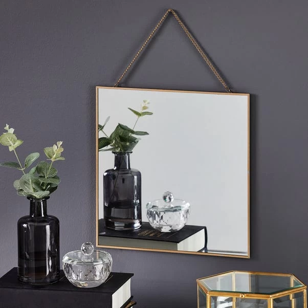 Update your walls with this contemporary, square shaped mirror. Featuring a stylish gold colourway with a gold chain detail, this mirror is ready to hang and would look great in a range of rooms.