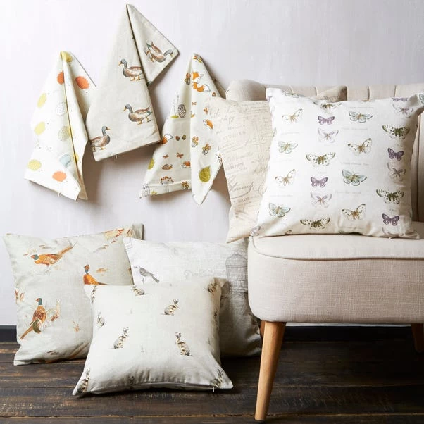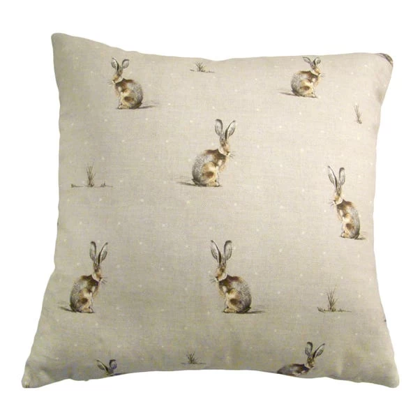Crafted from 100% cotton with a repeating hare pattern on a natural background, this square cushion has a removable cover which is machine washable.