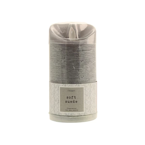 Infused with a warm scent of suede and tonka, this pillar candle is battery operated and emits a flickering warm white light.