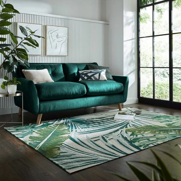 The Jungle Palm Chenille Rug pairs a statement jungle-inspired pattern with a deep green palette for a bold look on your floors. In an acrylic blend the Jungle Palm Chenille Rug is perfect for high-traffic areas, while the flat surface is perfect for sitting under furniture. We love using the Jungle Palm Chenille Rug in dining rooms and busy social zones.