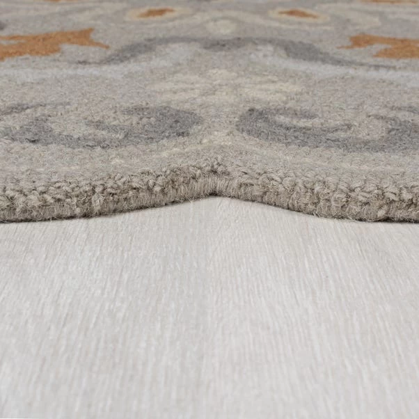 The Larch Wool Scallop Circle Rug injects a traditional look to any corner of your space. Pairing a unique scallop edge with floral motifs for a classic look underfoot. Neutral tones help create a calming feel. Hand-tufted by skilled rug artisans, the Larch Wool Scallop Circle Rug has a 100% wool pile for a warm and soft texture, the scallop edging gives a new take on the classic circle rug. We love using the Larch Wool Scallop Circle Rug to create a cosy corner to escape to.