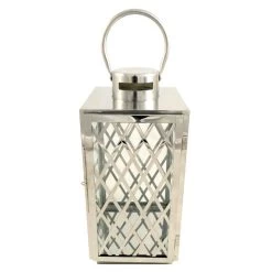 Intricately designed, this stylish chrome lantern features a modern lattice design and stainless steel handle and will hold a pillar candle.