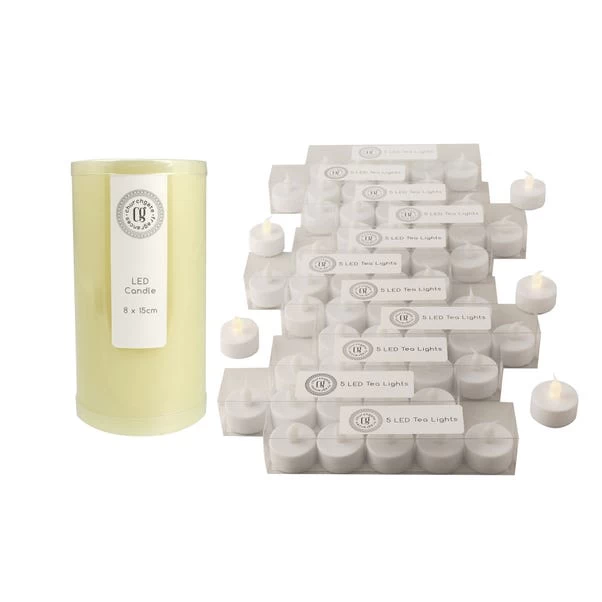 - Includes 60 x LED tealights and 1 x LED pillar candle