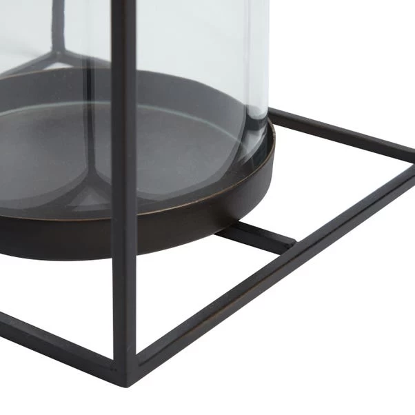 Create a gorgeous display of light and shadows with this gorgeous London lantern. This modern piece features a black metal frame with a glass candle holder and metal handle that is securely attached for easy transportation around your home. Complete this lantern with a LED candle pillar, perfect for creating a warm yellow flickering glow in your room.