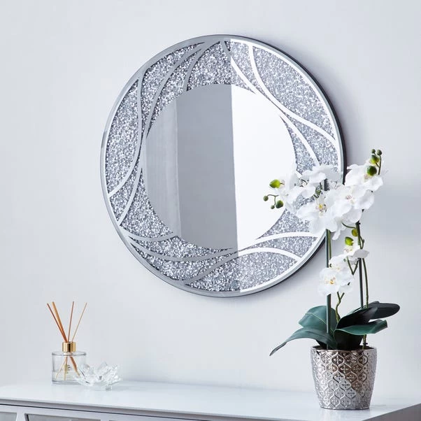 Featuring a circular shape with an elegant decorative frame, this stunning mirror would make a glamorous addition to your walls. The frame features a clear diamond design, complete with a silk screen finish to create a modern, yet timeless look.