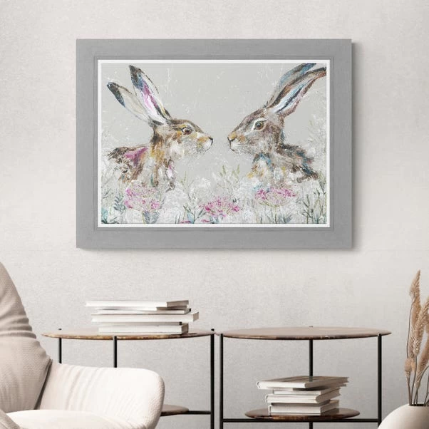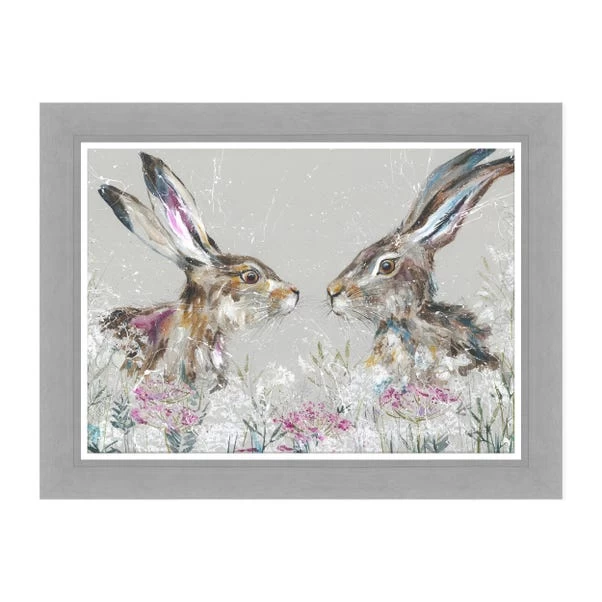 Showcase this beautiful textured print in your home for a wildlife inspired piece of artwork full of detail and delight. Depicting a couple of colourful hares with multicoloured accents, this artwork would be great for a gift to a loved one and would sit well in a living room or bedroom to offer vibrancy as well as a subtle contemporary feel with a cool grey frame.