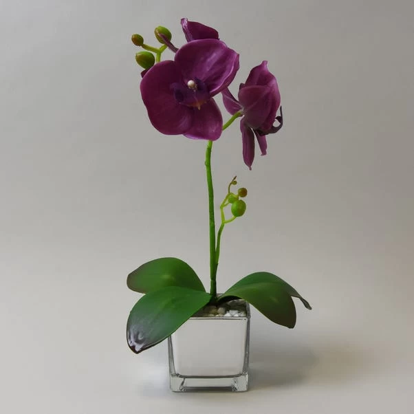Perfect for adding a little tranquility to your home, this stunning artificial plum Orchid boasts a realistic design and requires no maintenance. Complete with a silver coloured glass pot, this product is perfect for livening up any room in your home.