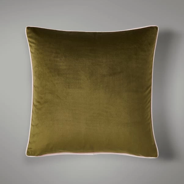 Featuring a stunning olive colourway with a blush reverse, this contemporary polyester hollowfibre filled cushion can be used as a stand-alone accessory and is a unique addition to any décor. Complete with piped detailing for a sophisticated edge, this cushion features a removable cover with a handy zip fastening for easy upkeep. When ironing this product, pull the cover inside out and iron on a medium setting.