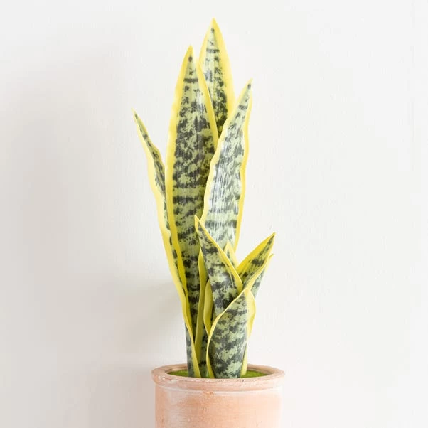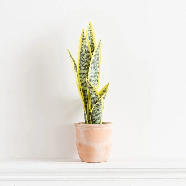 Add a pop of colour to your home with this exotic sansevieria plant in rustic terracotta pot. The highly detailed, printed leaves provide a realistic finish, making it ideal for displays on shelves, sideboards and tables.