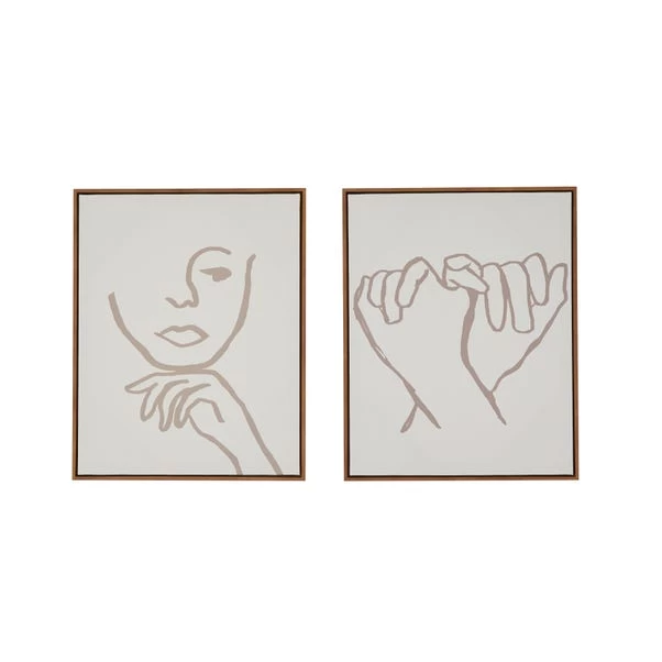 The Cap Canvas Natural Line Drawing is a set of 2 white canvas pieces with a natural line drawing of a face and hands in brown ink. The design is modern and clean, perfect for a bedroom or kitchen.