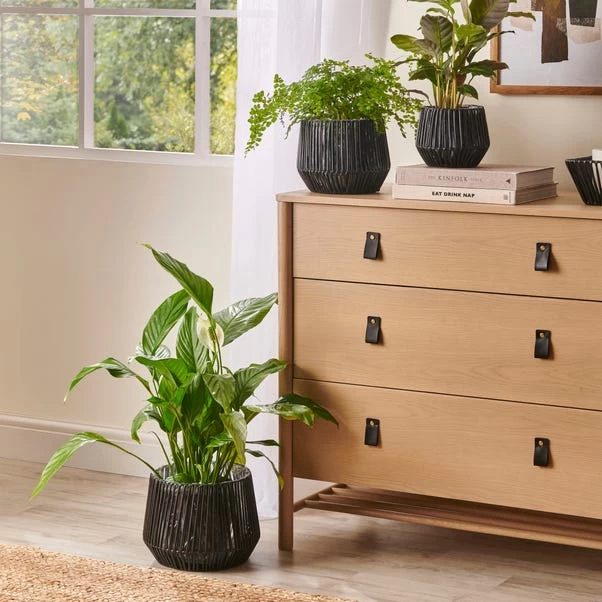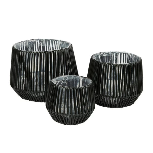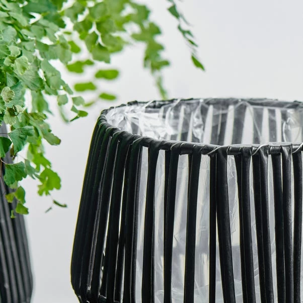 Display your plants in style with an environmentally friendly feel. This set of 3 woven style plant pots made from recycled plastic are great for a twist on the ordinary dull plant pot. With a sturdy metal frame and water-resistant qualities, this matching set will bring your home décor to life. The set includes 3 pots in varying sizes and is available in either a natural colour or a bold black colour to suit your current style.