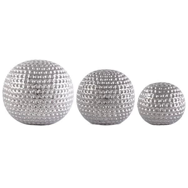 This set of three silver coloured ceramic sphere ornaments come in three different sizes and feature an all over dimple textured effect.