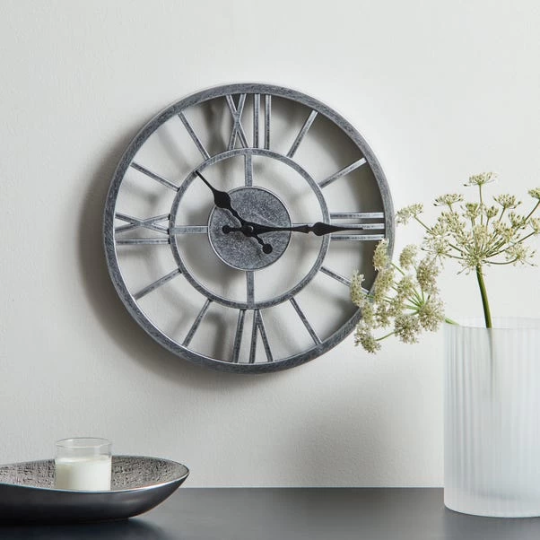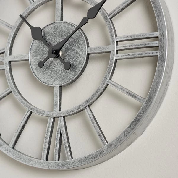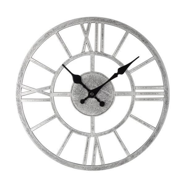 Designed with uncased hands and roman numeral figures, this quartz clock with silent movement has an antique silver colourway and circular shape for a classic look and feel, ideal for any room of the house.