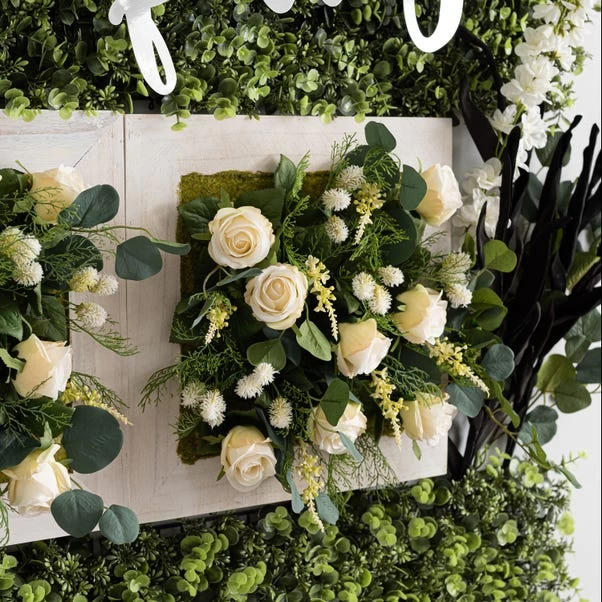 Ideal for wedding décor, this rustic white painted wooden frame with traditional florals features cream roses and dollar eucalyptus. Designed for easy display, using the hangers on the back, this piece can be matched with the range of co-ordinating traditional wedding florals.